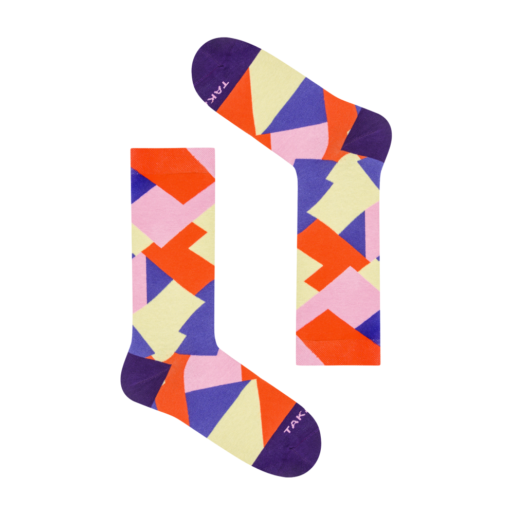 Geometryczne skarpetki Targowa 11m4 w pastelowych kolorach fioletu, pomarańczy i różu.